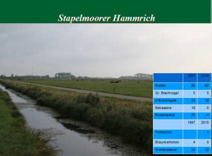 Der Stapelmoorer Hammrich, zwischen Vellage und Weener, ist ein großes Wiesengebiet mit hohem Grundwasserstand, aber die wenigen verbliebenen Uferschnepfen- und Rotschenkelpaare drängen sich auf dem Grünland westlich des Nesseborger Sees zusammen, wo sie rücksichtslos regelmäßig zur Brutzeit ausgemäht werden.