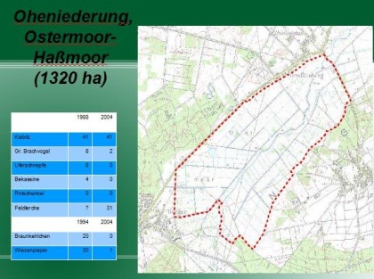 Dieses große Gebiet wird überwiegend intensiv bewirtschaftet. Es gibt nur noch einen kleinen Flecken, wo einige wenige Uferschnepfen brüten. Die Rotschenkelvorkommen scheinen sich nur noch auf die Wiedervernässungsflächen zu beschränken.